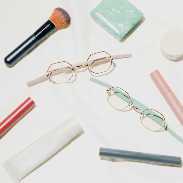 テンプルは、柔らかなニュアンスカラー。ストレート形状で、マスクをつけていても引っ掛かりが無く 、折りたたんで置いた状態もキュート。